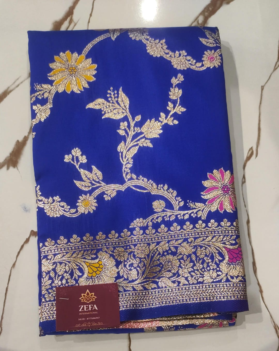 The Bishunpuri 3D Katan PB saree in royal blue, enhanced with intricate jari work, showcases a luxurious and eye-catching design. The deep blue fabric paired with shimmering gold accents creates a sophisticated and regal look, perfect for special celebrations.